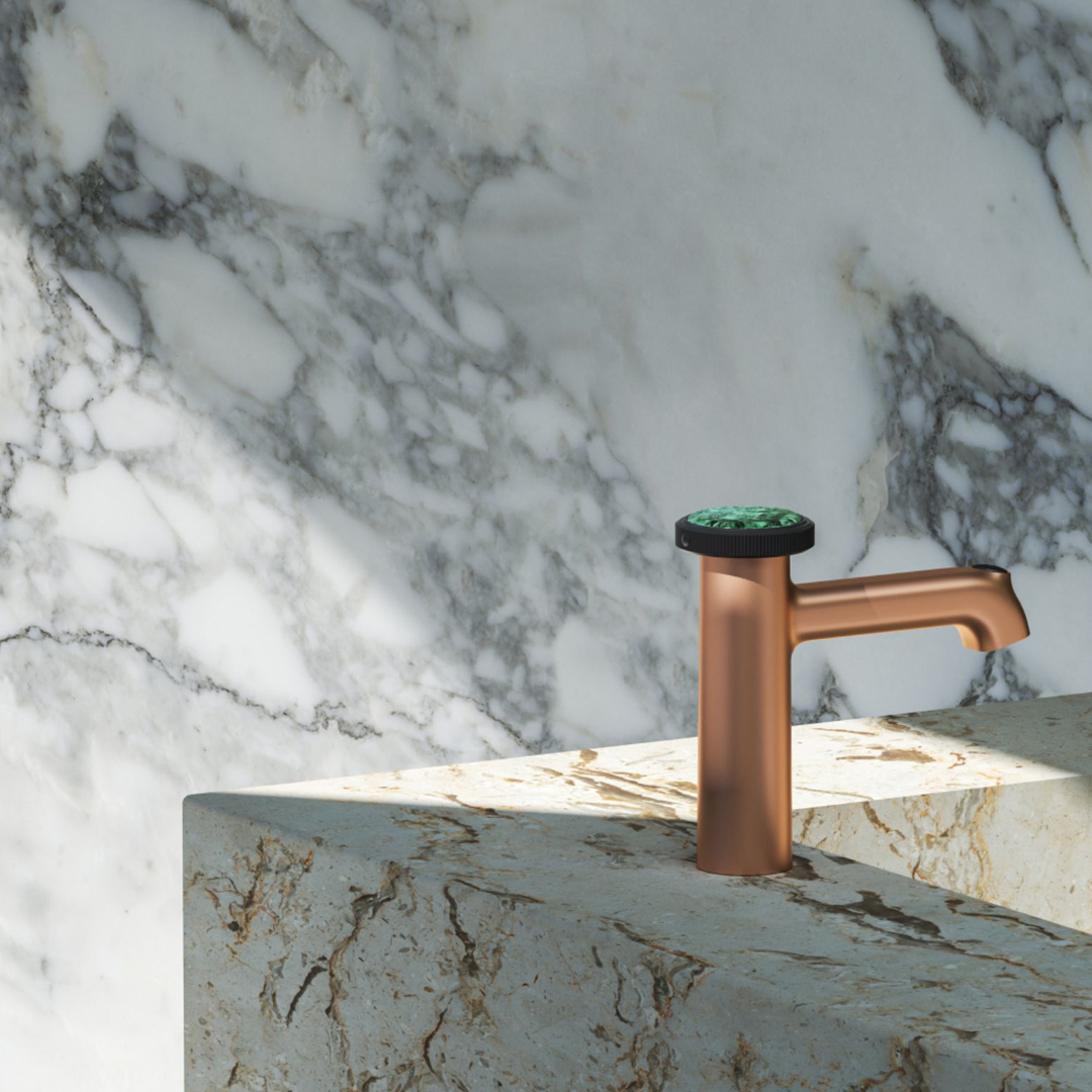The Kallie Knob Basin Mixer 27 1101-A2 combines refined design with innovative functionality. Featuring an Indian Green knob that adds a natural, elegant tone to your bathroom, it offers dual water outlets—downward flow for daily washing and upward spray for refreshing facial rinsing. Crafted from solid brass with a Wanhai cartridge, it ensures smooth temperature and flow control in a stylish deck-mounted design.