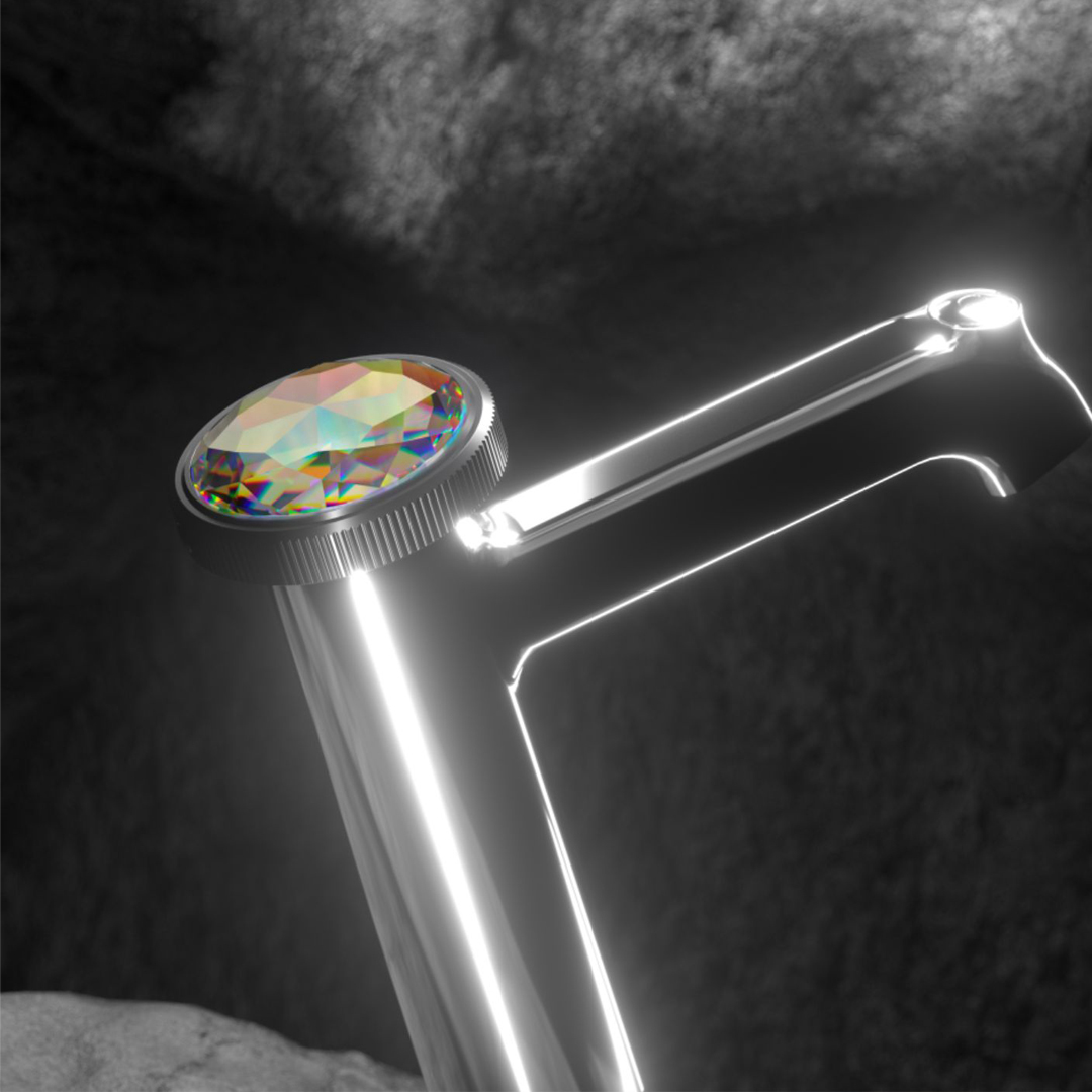 The Kallie Knob Basin Mixer 27 1101-B3 stands out with its stunning Gorgeous glass knob — a faceted, semi-round design that reflects vivid hues under light. Supporting hot and cold water with two modes, it offers both a downward flow and an upward facial spray. Made of solid brass with a Wanhai cartridge, it combines artistic brilliance with reliable everyday performance.