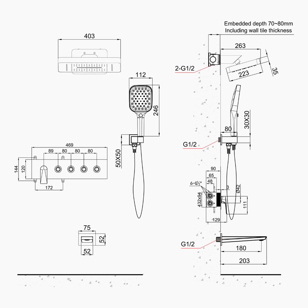 The Wall-mounted Shower / Bath Mixer is a wall-mounted bathroom copper hardware product that embodies contemporary architectural aesthetics as its core language. It is specially designed for high-end bathrooms that value spatial order and visual purity. Through the concealed structure design, the piping and valve system are ingeniously hidden, and only the most expressive exposed parts are presented. This enables the bathroom space to maintain a high degree of simplicity and rational beauty while ensuring complete functionality. The product not only meets the needs of switching between shower and bathtub, but also, with its refined and restrained design, becomes the visual focal point in modern bathrooms.